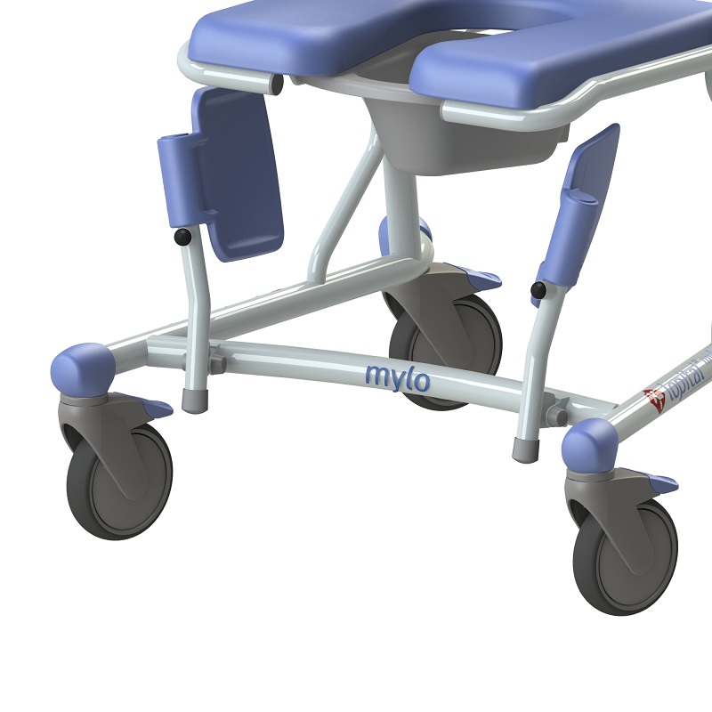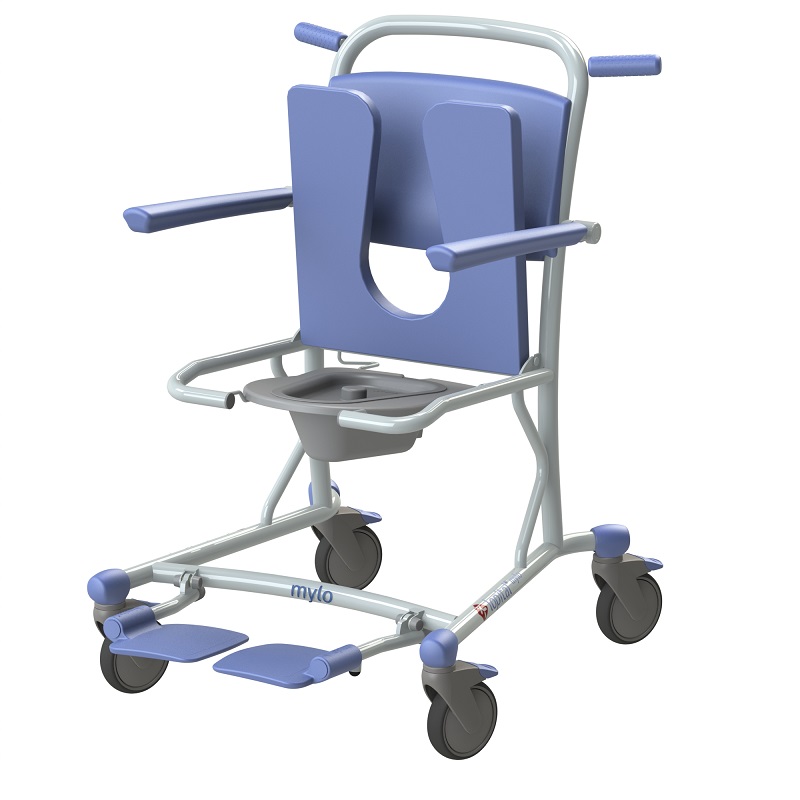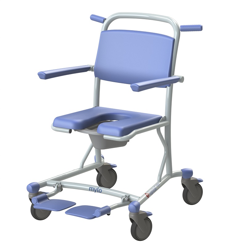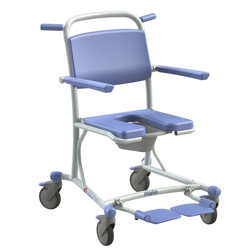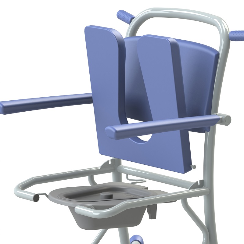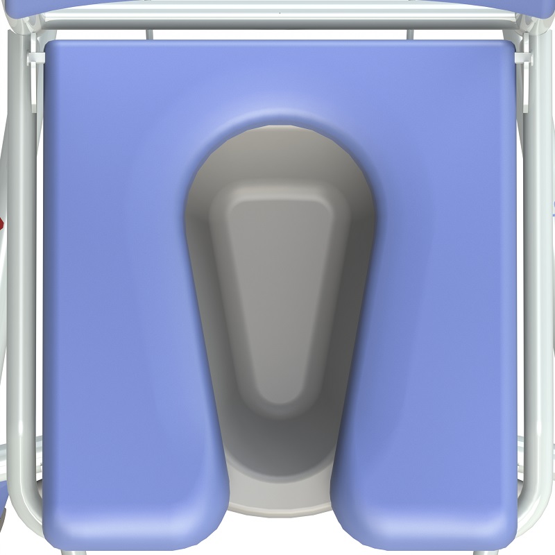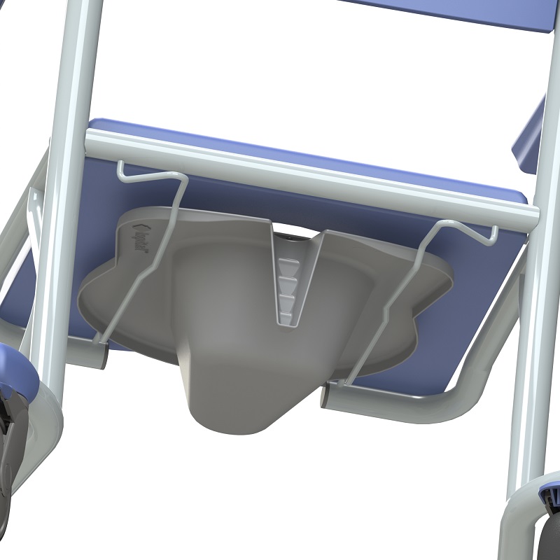Maximale Tragfähigkeit 150 kg. Klapp- und abnehmbarer Sitz für optimale Hygiene. Führungsschiene für Toiletteneimer oder Bettpfanne.